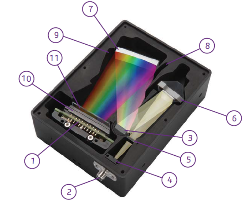 荷蘭Avantes公司的AvaSpec-VRS4096CL光纖光譜儀,采用對稱式光路設(shè)計,焦距75mm,包括光纖接頭(標準SMA接口)、準直鏡、衍射光柵、聚焦鏡和4096像素線陣CMOS探測器,波長范圍190-1100nm,分辨率高達0.05nm,提供USB3.0接口、高速網(wǎng)口和I/O外觸發(fā)同步接口。