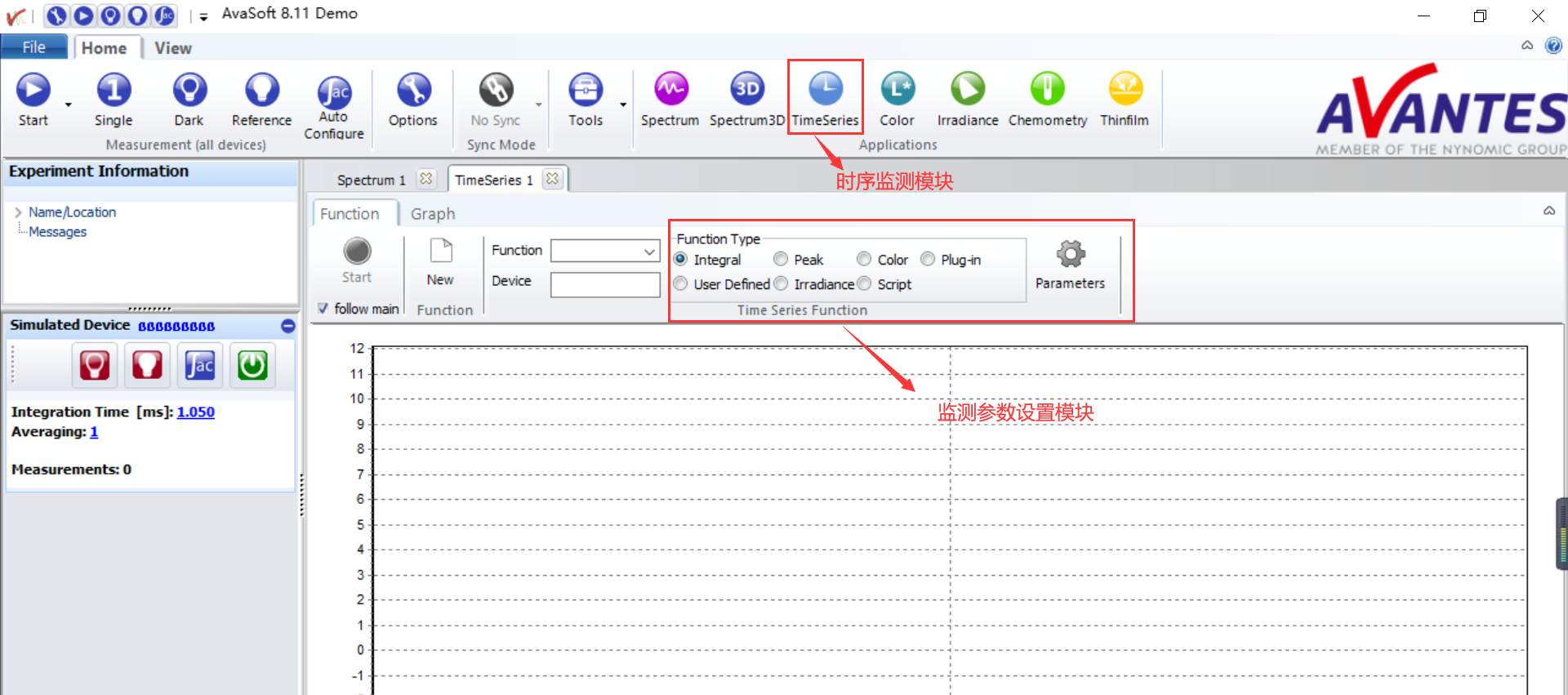 要監(jiān)測激光波長隨時間的變化,只需要在軟件中打開 TimeSeries模塊,設(shè)置希望監(jiān)測的參,就可以看到激光波長,峰值,強度等設(shè)置參數(shù)隨時間變化的曲線了。軟件還能夠允許您多窗口同步工作,同時監(jiān)測多個參數(shù)隨時間的變化。