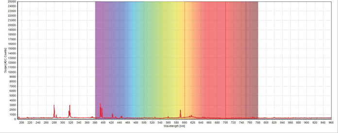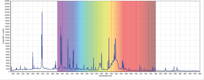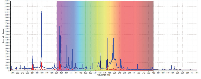 激光誘導擊穿光譜(LIBS)是一種原子發(fā)射光譜,它使用脈沖激光器作為激發(fā)源。激光脈沖聚焦到被測物體的表面,使被測材料表面的激光功率密度升高至一定程度。在如此之高的激光功率密度作用下,被測材料表面會有幾微克的物質(zhì)噴射出來,同時材料表面還會產(chǎn)生壽命很短但亮度很高的等離子體,其瞬間溫度可達10,000 攝氏度 。冷卻過程中,處于激發(fā)態(tài)的原子和離子從高能態(tài)躍遷至低能態(tài),此時不同元素會發(fā)射出其特定波長的光,在光譜圖中可以直接觀測到代表各元素波長的峰,從而揭示了樣品的組成。