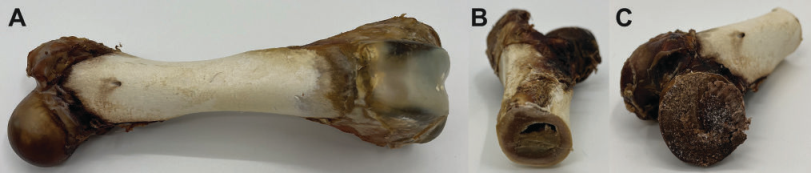圖1:(A)本實驗所用的骨樣品:寵物店售賣的火腿骨樣品,將其鋸成兩塊。(B):密質(zhì)骨測量樣品:沿徑向橫截面測量 (C):松質(zhì)骨樣本:在球關節(jié)處測量