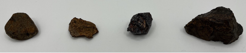 本次實(shí)驗(yàn)的目的是:利用LIBS鑒別四個(gè)巖石樣品中的隕石和陸地巖石。 實(shí)驗(yàn)共有四個(gè)樣品,其中兩個(gè)樣品為隕石樣品,分別是H5普通球粒隕石和鎳鐵隕石。另外兩個(gè)樣品為氧化鐵(FeO2)和二氧化鈦(TiO2)。 實(shí)驗(yàn)中我們采用了AvaSoft中的原始數(shù)據(jù)扣除暗背景模式,即Sd模式。使用此模式可以減少噪聲,并更好地隔離和識(shí)別等離子體峰。我們將積分時(shí)間設(shè)置為10ms,平均次數(shù)設(shè)置為1。 圖1:本次實(shí)驗(yàn)所用的巖石和隕石樣品(從左至右依次為:H5普通球粒隕石、鎳鐵隕石、氧化鐵、二氧化鈦)