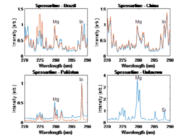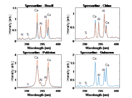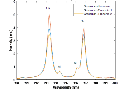 3. LIBS技術(shù)分析元素 圖5:LIBS實(shí)驗(yàn)系統(tǒng) 為了對前面的研究結(jié)果做進(jìn)一步的深入分析,我們使用了Avantes LIBS系統(tǒng)(圖5, AvaSpec-Mini2048CL, 200-450nm, 0.25nm分辨率)對所有石榴石樣品進(jìn)行了分析,這個(gè)光譜范圍特別適合于石榴石的成分分析,因?yàn)樗臉?gòu)成元素如Al, Ca, Si, Fe, Mg在這個(gè)范圍都會(huì)產(chǎn)生很強(qiáng)的LIBS譜線。假設(shè)巴西樣品的Mg含量比中國和巴基斯坦樣品的Mg含量更高,我們可以再通過觀察280nm處的Mg譜線和288nm處的Si譜線進(jìn)行驗(yàn)證。由于所有種類的石榴石都具有相同的Si含量,所以我們將所有光譜歸一化到288nm,來比較其相對峰值強(qiáng)度。如圖6所示,巴西樣品的Mg濃度明顯高于巴基斯坦樣品,但低于中國樣品。除此之外,右下光譜圖是一份未知產(chǎn)地的錳鋁榴石樣品,它的Mg譜線強(qiáng)度較大,說明Mg濃度較高,這個(gè)結(jié)果與其外觀特征相符合。如圖7所示,未知樣品呈深紅色,相比錳鋁榴石更接近鎂鋁榴石。 圖6:石榴石的Mg / Si 元素LIBS光譜 圖7:來自不同地區(qū)的錳鋁榴石(a)中國,(b)巴西,(c)巴基斯坦,(d)來源不明的未知樣品 接下來,我們分析了395 nm特征峰處Ca / Al的光譜數(shù)據(jù)。發(fā)現(xiàn)所有石榴石的Al含量幾乎相同(見圖8)所以我們選擇了396 nm的Al譜線作歸一化處理。左下圖為巴基斯坦樣品的光譜圖,可以看出巴基斯坦樣品的Ca含量明顯高于其他樣品。結(jié)合圖6可以發(fā)現(xiàn):與其他地區(qū)相比,巴基斯坦樣品中鈣的含量較高而Mg的含量較低,這就是為什么它與中國和巴西的樣品相比拉曼光譜相關(guān)性較低。 圖8:Ca / Al 不同含量的石榴石LIBS光譜圖 實(shí)驗(yàn)表明,他們都屬于錳鋁榴石,但巴西、中國、未知樣品的特性更像鎂鋁榴石,而巴基斯坦的樣品特性更像鈣鋁榴石。為了進(jìn)一步驗(yàn)證巴基斯坦樣品是否更像鈣鋁榴石,如圖9所示,我們對比了其他三種鎂鋁榴石樣品和巴基斯坦樣品的LIBS光譜。 圖9: Ca / Al 區(qū)域的鈣鋁榴石LIBS光譜