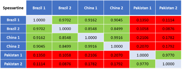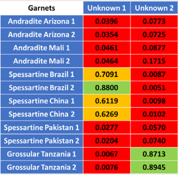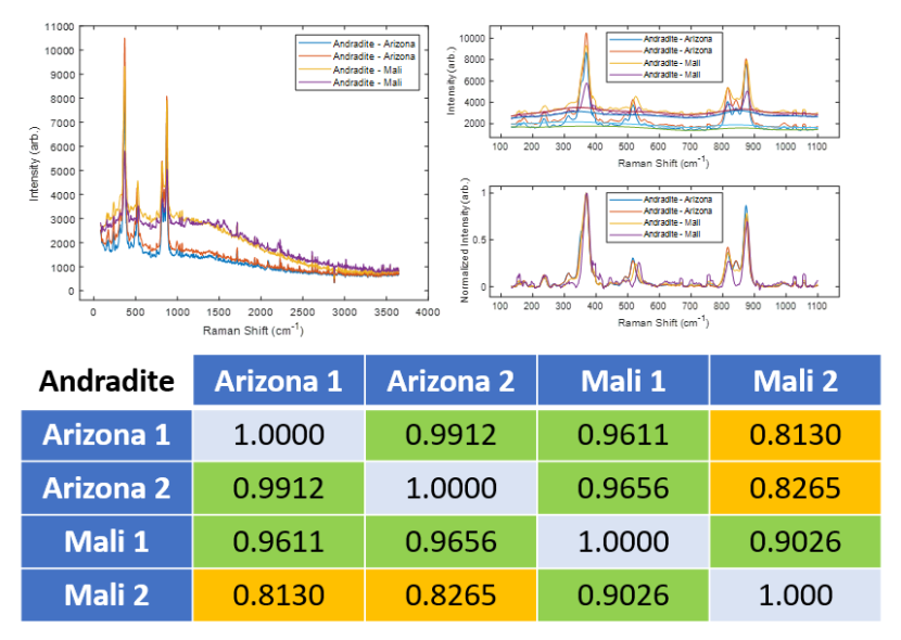2. 拉曼光譜測量 圖1:拉曼光譜實(shí)驗(yàn)裝置 我們以 14 種不同石榴石的樣品為例,其中 12 種已知物種和來源,2種未知物種和來源。測量系統(tǒng)采用 AvaSpec-Mini4096CL 型光譜儀和 AvaLaser 785高靈敏度拉曼探頭(內(nèi)置一臺(tái)波長穩(wěn)定的785nm激光器)來獲取拉曼光譜。 我們采用光譜相關(guān)法HQI比較來自不同樣品的拉曼光譜差異,它通過一個(gè)單一數(shù)值來表征兩個(gè)光譜彼此之間的相關(guān)性(1全相關(guān),0完全不相關(guān))。對光譜進(jìn)行數(shù)據(jù)處理后,結(jié)果表明HQI> 0.85為強(qiáng)相關(guān)(綠色),0.85 > HQI > 0.5為弱相關(guān)(黃色),HQI < 0.5為不相關(guān)(紅色)。表格為實(shí)驗(yàn)中的幾例樣品,比較了四種不同的鈣鐵榴石樣品。如圖所示,來自亞利桑那州的兩個(gè)樣品非常相關(guān)(HQI=0.9912),來自馬里的兩個(gè)樣品也非常相關(guān)(HQI=0.9026)。除此之外,馬里樣品1與亞利桑那州樣品1有很強(qiáng)的相關(guān)性(HQI = 0.9611),馬里樣品2與亞利桑那州樣品1僅為弱相關(guān)(HQI = 0.8130),結(jié)果表明相關(guān)性對于識別相似樣品的拉曼光譜非常有效。 圖2:原始光譜數(shù)據(jù)(左上)、基線校正和歸一化光譜(右上)、亞利桑那州和馬里樣品HQI數(shù)據(jù)圖 用相同的方法測量6種錳鋁榴石樣品。HQI結(jié)果如圖3所示,來自巴西和中國的錳鋁榴石樣品相關(guān)性較強(qiáng),但來自巴基斯坦的樣品只與自身樣品存在相關(guān)性,結(jié)果讓我們都非常意外,因?yàn)橹袊桶突固沟臉悠吩谝曈X上更相似。但巴基斯坦的樣品在近紅外的吸收比其他兩個(gè)產(chǎn)地的樣品低,所以我們使用LIBS技術(shù)進(jìn)一步研究產(chǎn)生這些差異的原因。 圖3:巴西、中國、巴基斯坦樣品HQI數(shù)據(jù)圖 通過分析12個(gè)已知樣品的拉曼光譜的HQI相關(guān)性,我們對剩余2種未知石榴石進(jìn)行了分類。結(jié)果如圖4所示,我們可以識別未知樣品1為錳鋁榴石,未知樣品2為鈣鋁榴石。另外,未知樣品1與巴西樣品2的相關(guān)性比與中國樣品的相關(guān)性更強(qiáng),而與巴基斯坦樣品的相關(guān)性不高。 圖4:未知樣品的與所有已知樣品HQI數(shù)據(jù)圖