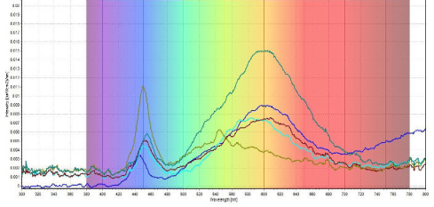 實驗結(jié)果中,有兩個數(shù)據(jù)十分有趣。樣品1,深藍色譜線,不僅在近紅外區(qū)域呈指數(shù)上升,而且在540-660 nm區(qū)域出現(xiàn)峰,表明這個圣誕彩燈樣品中既有LED燈,也有白熾燈。因此,樣品1被歸類為LED燈和白熾燈,它的譜圖同時出現(xiàn)在圖3和圖4中。樣品3,粉紅色譜線,在560-620 nm區(qū)域出現(xiàn)許多有別于其他樣品的峰。