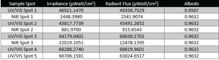 反射光譜圖分析表明,所有被測(cè)點(diǎn)的紫外-可見(jiàn)光譜范圍反射率曲線相對(duì)平坦,該范圍的后端(即1050-1100 nm)在樣品點(diǎn)1(圖2)、2(圖3)和5(圖6)中略微向下彎曲,在樣品點(diǎn)3(圖4)和4(圖5)中略微向上彎曲。與樣品點(diǎn)1和2相比,樣品點(diǎn)3、4和5的反射率總體上更高。這兩種差異都與光強(qiáng)度更大,總輻照度值更高有關(guān)。但是這并不會(huì)導(dǎo)致反照率值的增加,因?yàn)檩椛渫侩S之成比例增大。
