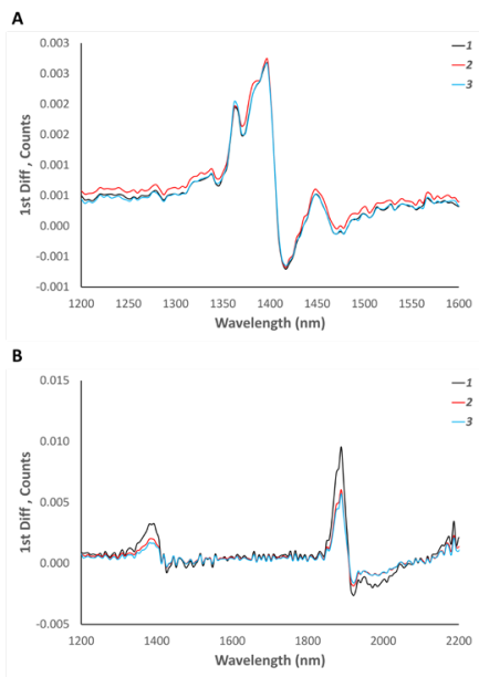 圖2:使用NIR1.7 (圖A)和NIR2.5 (圖B)測(cè)量經(jīng)微分處理后的二氧化硅顆粒(樣品1、2、3)的光譜圖