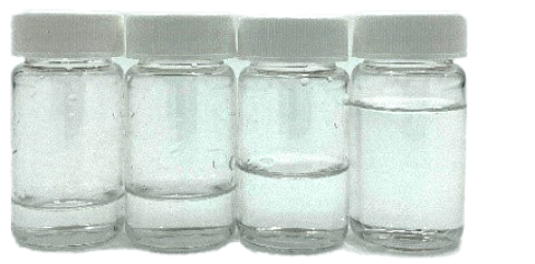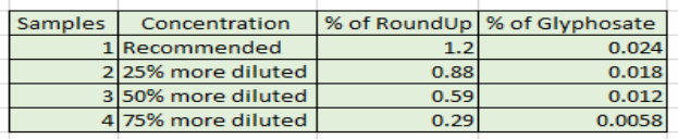 如圖3,農(nóng)達除草劑的稀釋推薦配比為:1.5盎司(3湯匙)農(nóng)達除草劑與1加侖水混合,此時農(nóng)達除草劑樣品的濃度約為1.2%。在溶質重量保持不變的情況下,其他三種樣品分別比推薦濃度多稀釋了25%,50%和75%。(此濃度是根據(jù)其他三種濃度確定,這三種樣品的濃度分別比推薦濃度稀釋率高25%、50%和75%。) 圖3:稀釋后農(nóng)達除草劑樣品的濃度和百分比 溶劑是去離子水,用來稀釋草甘膦含量為2%的農(nóng)達溶液,稀釋后得到四種樣品濃度分別為1.2%、0.88%、0.59%和0.29%(圖3)。這四種樣品中草甘膦百分比分別為0.024%、0.018%、0.012%和0.0058%(圖3)。稀釋后的四種樣品如圖4所示。 圖4:稀釋后4種不同濃度的農(nóng)達除草劑溶液