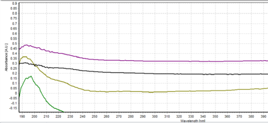 5mm光程探頭測量光譜的一致性不如10mm探頭的測量光譜。樣品2(紫色,稀釋程度增加25%)和樣品4(黑色,稀釋程度增加75%)的光譜形狀與其他兩個樣品不一樣。并且樣品2和樣品4的吸光度譜線達到峰值后并沒有迅速降低,而是并未真正下降。這些結果證明,5mm光程探頭的測量結果不如10mm光程探頭的測量結果可靠。這與我們最初的假設一致:因為四個樣品都被充分稀釋,所以10mm光程探頭可以得到更好的測量結果。 使用5mm/10mm光程探頭測量 農(nóng)達溶液的吸光度 圖7:使用5mm/10mm光程探頭測量適宜濃度溶液 使用5mm/10mm光程探頭測量 農(nóng)達溶液的吸光度 圖8:使用5mm/10mm光程探頭測量稀釋度增加25%的溶液 使用5mm/10mm光程探頭測量 農(nóng)達溶液的吸光度 圖9:使用5mm/10mm光程探頭測量稀釋度增加50%的溶液 使用5mm/10mm光程探頭測量 農(nóng)達溶液的吸光度 圖10:使用5mm/10mm光程探頭測量稀釋度增加75%的溶液 使用5mm/10mm光程探頭測量 農(nóng)達溶液的吸光度 圖11:使用5mm/10mm光程探頭測量的所有結果 圖7、8、9和10對比了每個樣品的10mm光程探頭和5mm光程探頭的測試結果??梢钥吹绞褂?0mm光程探頭的5mm光程探頭的測量結果更準確。圖11是本實驗的所有光譜結果匯總。