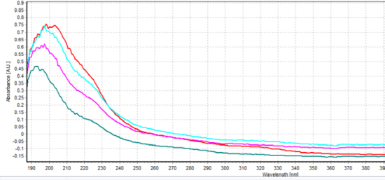 測試樣品前,我們設置光譜儀的積分時間為30ms,AvaLight-XE-HP光源的閃光次數(shù)為3次。我們首先使用10mm光程長度測試了四個樣本,我們選擇吸光度模式,先存儲暗噪聲來消除儀器自帶的噪聲,以溶劑(去離子水)作參考。使用10mm光程長度探頭的吸光度測量結果如圖5所示。 圖5: 使用10mm光程長度探頭的吸光度測量結果 純草甘膦的吸光度峰在265 nm左右,而稀釋后的草甘膦吸光度峰可位于200 ~ 300nm的任意波長處。我們在實驗中測得的峰在200nm左右,光譜形狀也與其他研究者的光譜數(shù)據(jù)一致。因此可以證明,使用10mm光程長度的探頭可以很好地測量四種農(nóng)達除草劑稀釋溶液中的草甘膦。 圖6: 使用5mm光程長度探頭的吸光度測量結 第二次實驗使用的是5mm光程長度探頭,我們設置光譜儀的積分時間為20ms,AvaLight-XE-HP光源的閃光次數(shù)為2次,這樣做是為了避免出現(xiàn)飽和情況,測量結果如圖6.