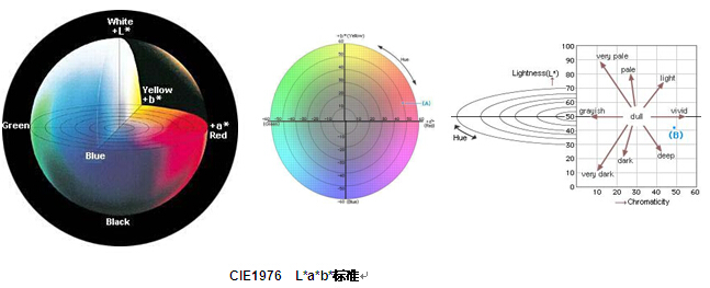 物體的顏色可以用CIE1976(L*a*b*)顏色空間表示。L*值表示顏色的亮度,正的a*值表示顏色的紅色值,負(fù)的a*值表示顏色的綠色值。近似地,黃色和藍(lán)色值由b坐標(biāo)值表示,正值表示顏色的黃色值,負(fù)值表示顏色的藍(lán)色值。L*a*b*各值可以根據(jù)樣品(物體)的CIE三刺激值X,Y,Z和標(biāo)準(zhǔn)光源的三刺激值Xn,Yn,Zn得到,標(biāo)準(zhǔn)光源的三刺激值Xn,Yn,Zn為常量,僅取決于所選擇的標(biāo)準(zhǔn)光源的類型。