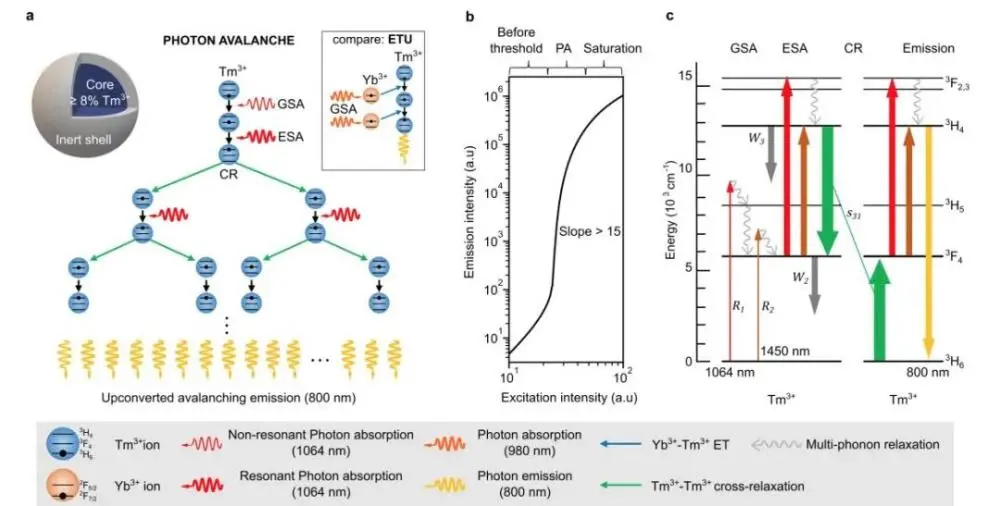 哥倫比亞工程研究人員已經(jīng)在納米顆粒中實現(xiàn)的光子雪崩機(jī)理反應(yīng)過程圖示。